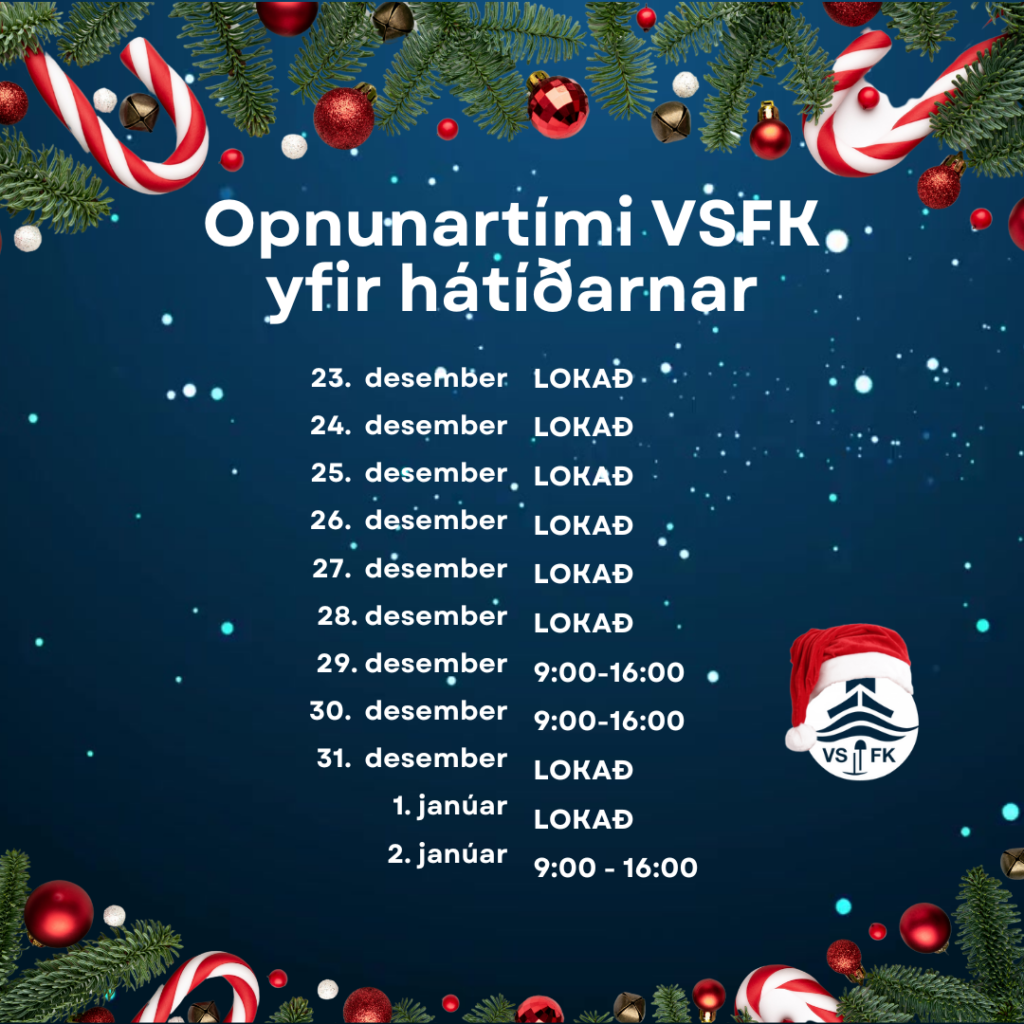 Skrifstofa VSFK verður lokuð 23. desember, á Þorláksmessu. Skrifstofan opnar aftur 29. desember, á hefðbundnum tíma klukkan 9:00. Opið er þann dag og 30. desember en lokað á gamlársdag 31. desember.